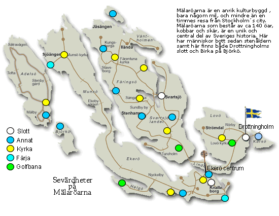 Fantans hög Skå kyrka Kaggeholm Skå flygfält Adelsö kyrka Birka Linfärja Eldgarnsö Sånga säby Svartsjö slott Färjeläget Ekerö kyrka Ekebyhovs slott Ekebyhovskyrkan Tappström Brostugan Drottningholm Drottningholms golfbana Lovö kyrka Troxhammars golfbana Stenhamra Sånga kyrka Hilleshögs kyrka Färentuna kyrka Kungberga Munsö kyrka